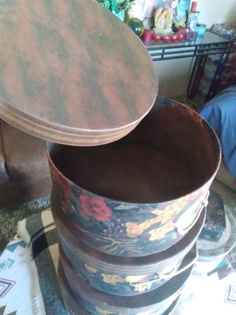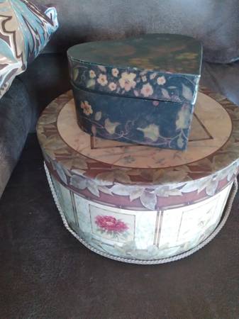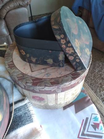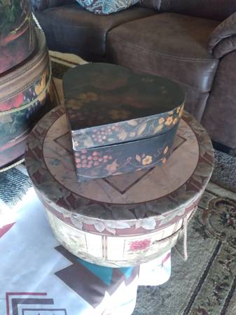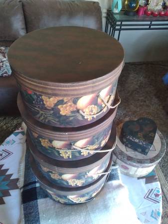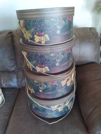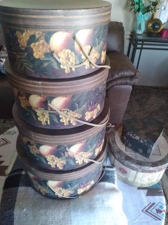 Round Decorative Storage Bins set of 4 with fruit $20 12inch, 13inch 14 inch and 15 inch single 12 inch with flowers $5 plus 7 inch heart shape with flowers $5 price firm, like new condition